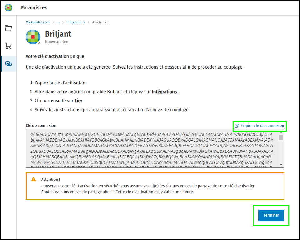 Cliquez sur le bouton Générer une clé d'activation et sur le lien Copier clé de connexion. La clé sera alors enregistrée dans la mémoire de votre ordinateur.