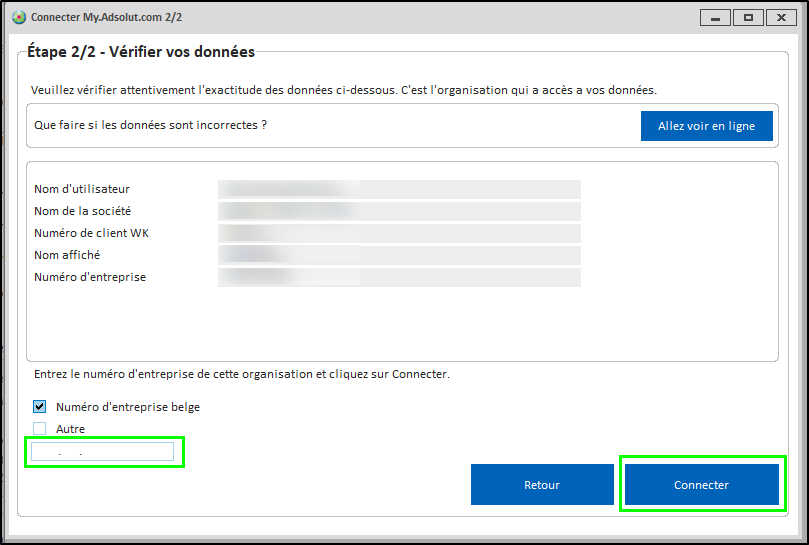 À titre de mesure de contrôle, il vous sera encore demandé de saisir le numéro d'entreprise de votre organisation au bas de l'écran suivant.