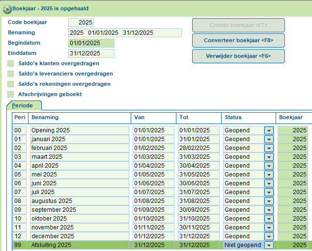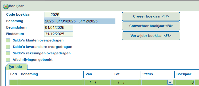 U klikt nu op F7 Creëer boekjaar. Vervolgens plaatst u voor alle periodes de Status op Geopend.