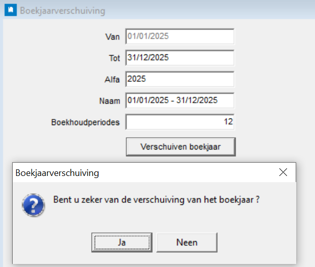 U plaatst de cursor in het veld Boekjaar en geeft het nieuwe boekjaar (2025) in.
