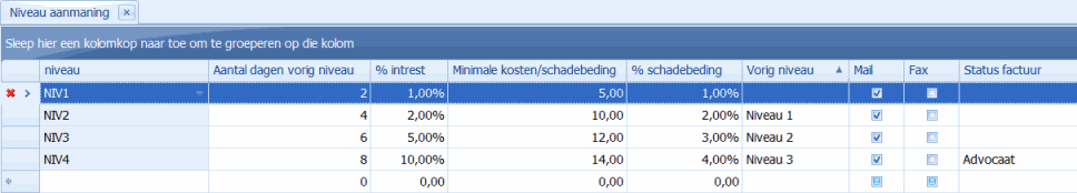 Het niveau van de aanmaningen vindt u onder parameters > boekhouding > niveau aanmaningen