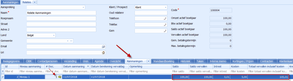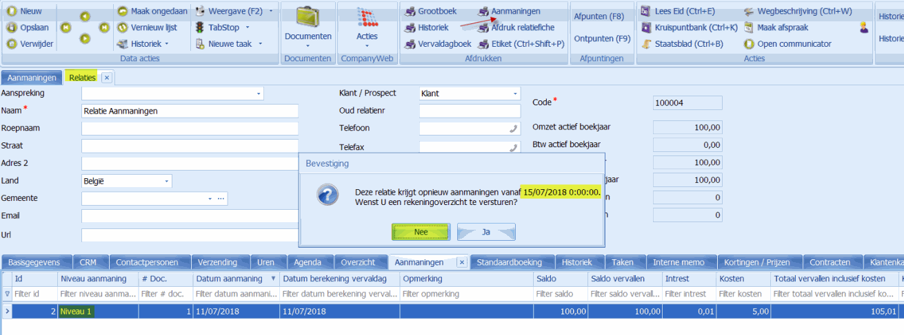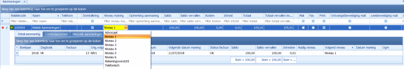 In ons voorbeeld zien we dat deze relatie op 15/07/2018 aanmaning niveau 2 zal ontvangen.