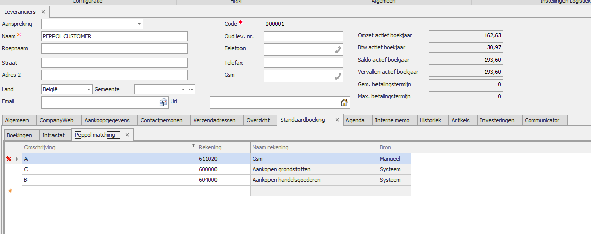 Indien het vinkje 'Toewijz. rekening via artikel Peppol' wordt uitgezet op de leverancier of als de dossier setting is ingesteld op 'Geen', dan wordt de standaardboeking terug gebruikt.