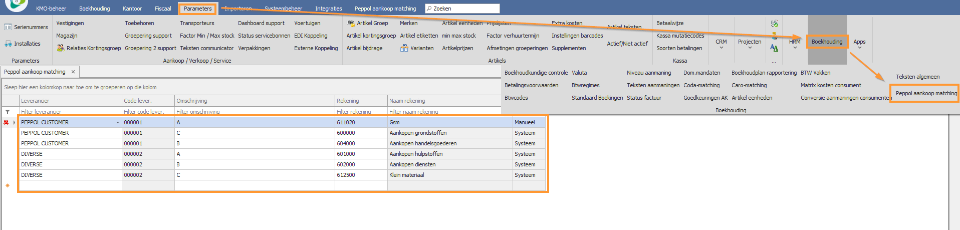 B) het menu item 'Parameters::Boekhouding::Peppol aankoop matching'