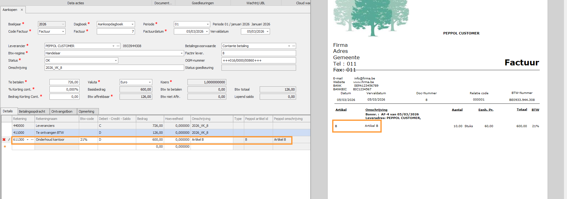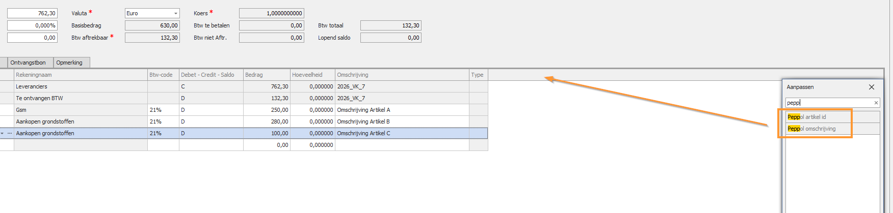 - Toewijzen rekening via artikel Peppol is aangevinkt