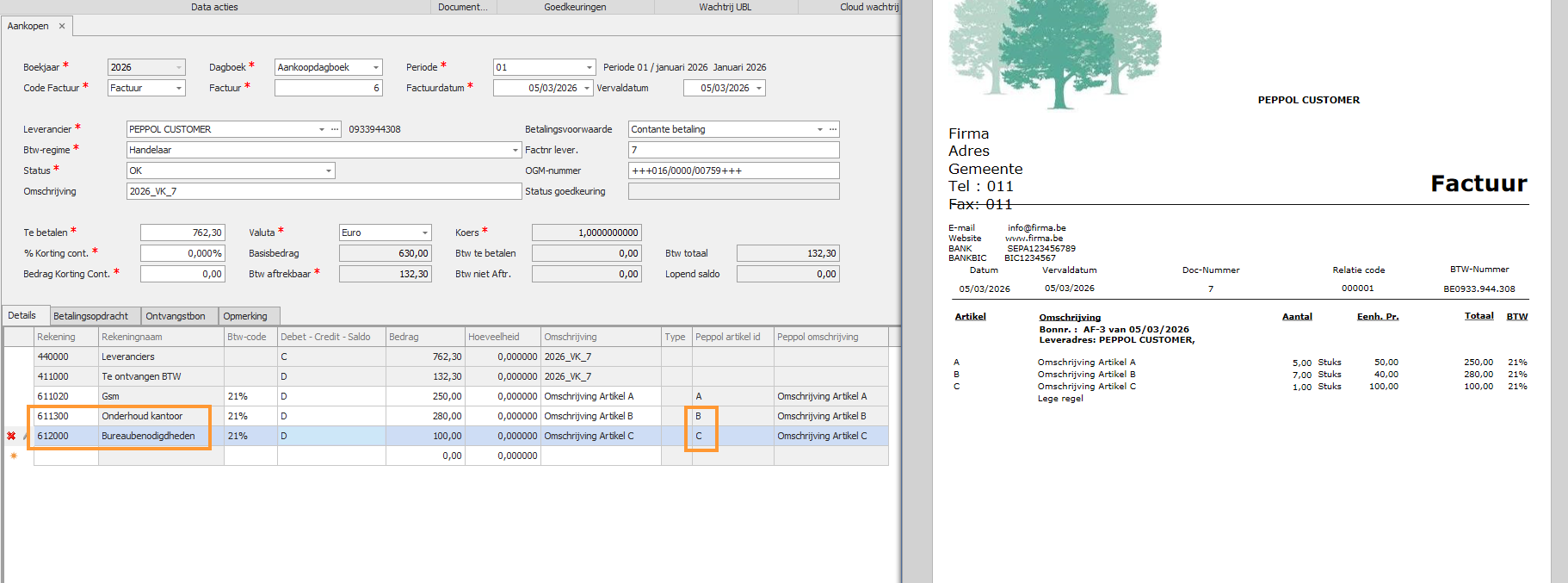De factuur die wordt ingelezen bevat 3 detaillijnen met artikel A, B en C.