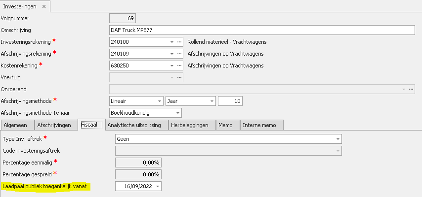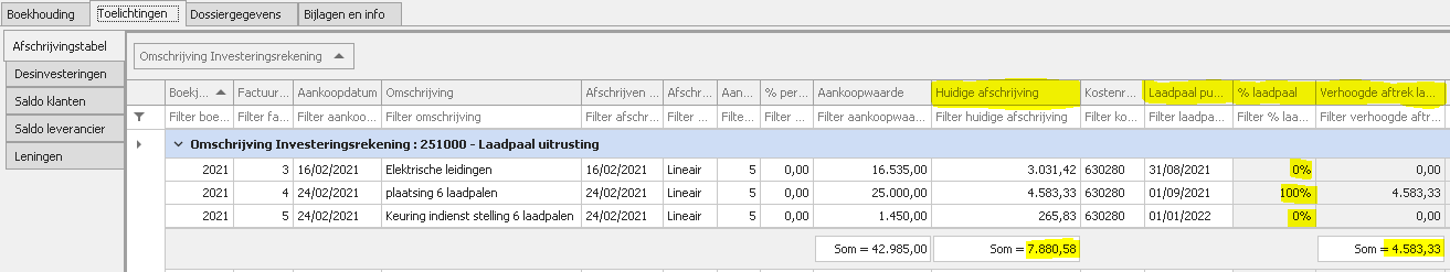 In Fiscaal Dossier wordt bij het inlezen van de afschrijvingstabel automatische alle gegevens met betrekking tot de laadpalen overgenomen als extra velden in de afschrijvingstabel.