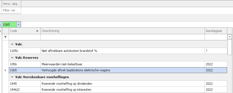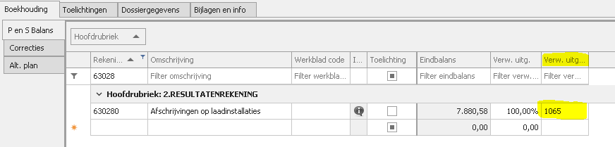 - De corresponderende kosten rekening van de afschrijvingen dient in de proef- en saldibalans de juiste fiscale rubriek te bevatten (code 1065).