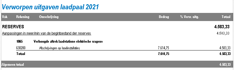 - Het totaalbedrag van de verworpen uitgaven: komt overeen met de som van de details van de laadpalen in het scherm van de afschrijvingstabel.