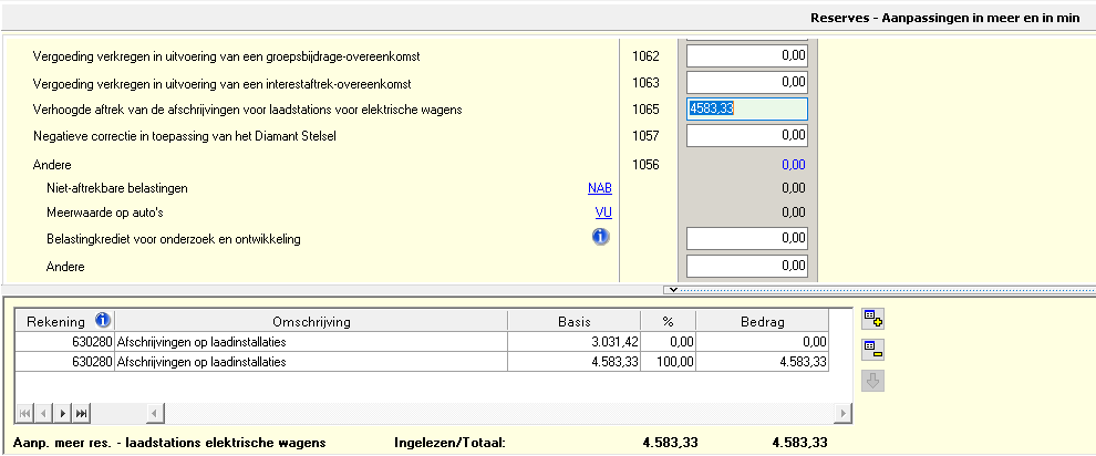 In Superfisc Vennootschapsbelasting wordt de verhoogde aftrek voor investeringen in laadpalen verwerkt in de rubriek 1065 “Verhoogde aftrek van de afschrijvingen voor laadstations voor elektrische wagens”. Deze rubriek kan gevonden worden onder het vak van de reserves, aanpassing in meer en in min.