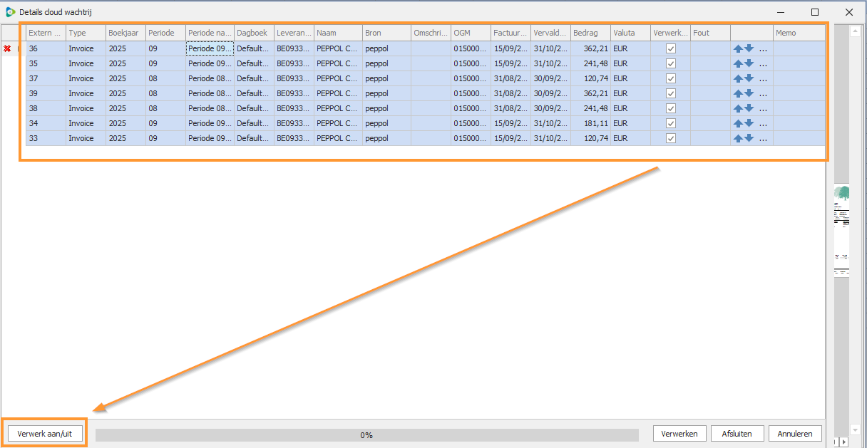 2.1 Selectie van facturen verwerken via "Details cloud wachtrij"