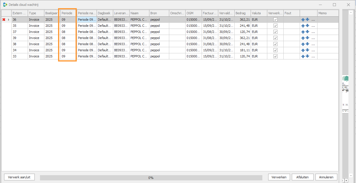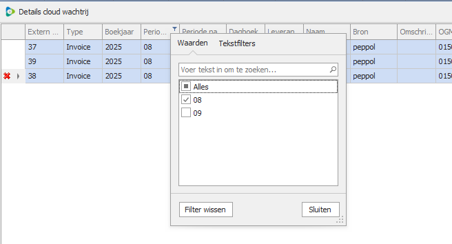 Via 'Details cloud wachtrij' is het ook mogelijk om een specifieke selectie van facturen in bulk te boeken. Zo kun je er bijvoorbeeld voor kiezen om alle facturen van een bepaalde maand in één keer te verwerken via de details cloud wachtrij.