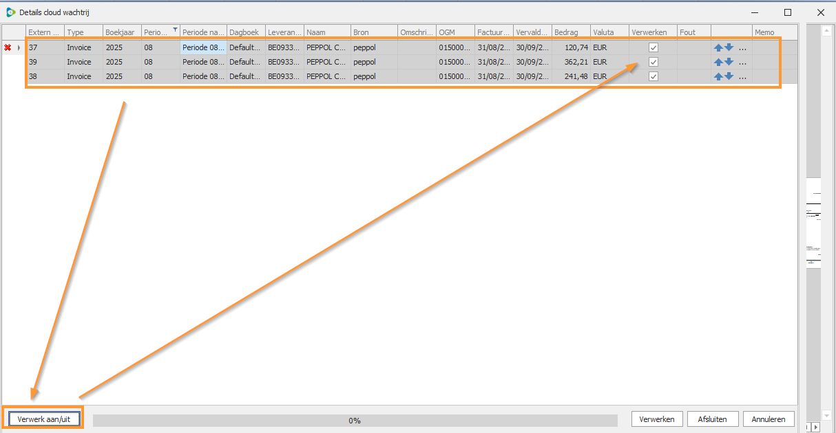 Je kunt via de vinkjes aanduiden welke facturen je wenst te verwerken.