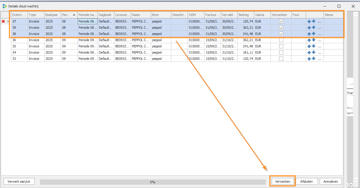 Klik vervolgens op Verwerken om de geselecteerde facturen te boeken.