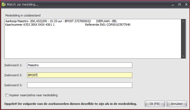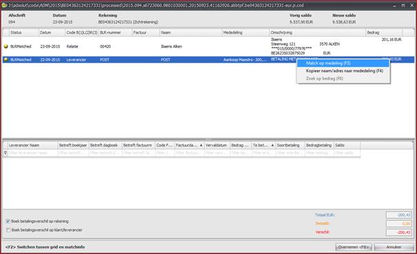 Matchen op de inhoud van de mededeling (in de CODA dialog via F3 of via rechtermuis en menu op grid; opgelet: het BLR-nummer moet wel ingevuld zijn). Het BLR-nummer is de code die achter de relatie/leverancier/grootboekrekening hangt.