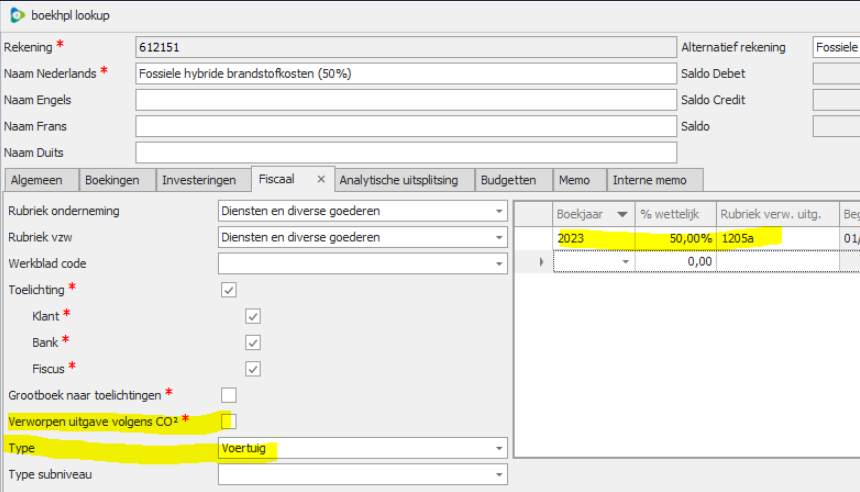 Vanaf 1 juli 2023 is de aftrek van de fossiele brandstofkosten gelimiteerd voor wat betreft de hybride voertuigen. Daarom raden we aan om het rekeningstelsel uit te breiden met een extra rekening om die kosten correct fiscaal te registreren.