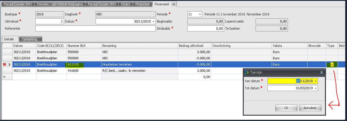 In deze case vinden we de huur terug in het financieel dagboek van de boekhouding. In dit geval wordt de type toelichting “Termijn” gebruikt.