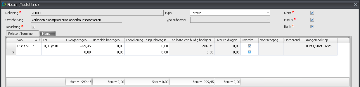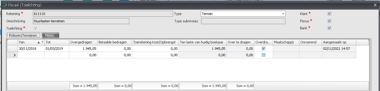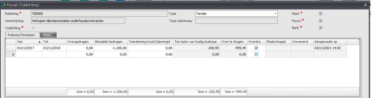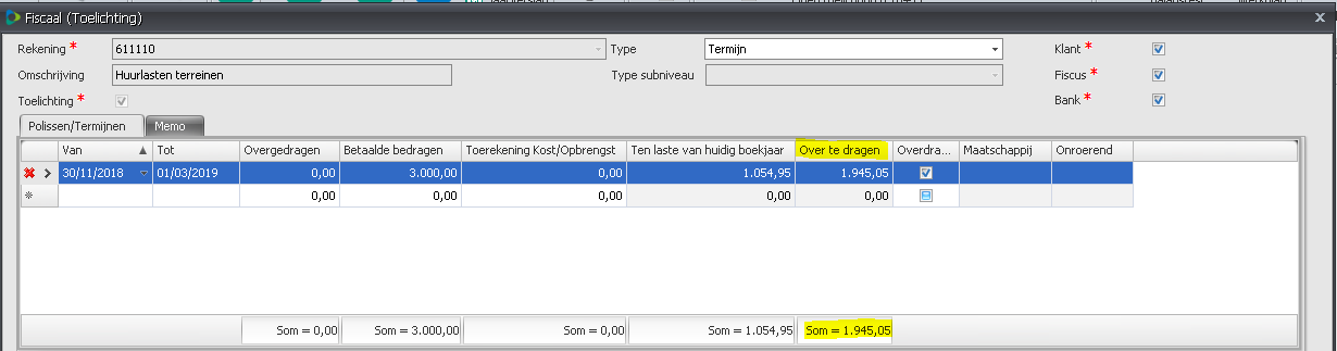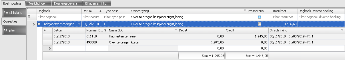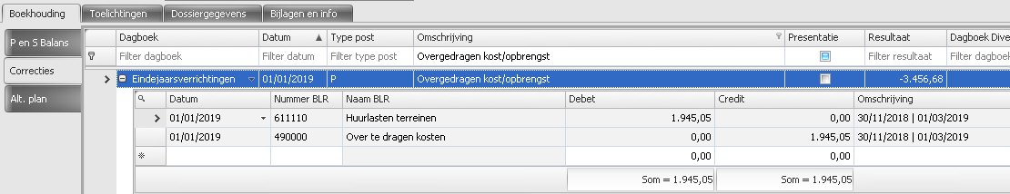 De boeking kan teruggevonden worden onder het tabje Boekhouding > Correcties met als omschrijving “Over te dragen kost/opbrengst/lening