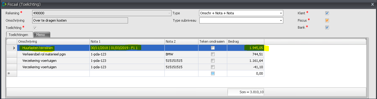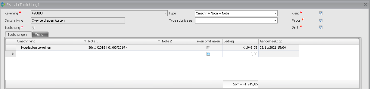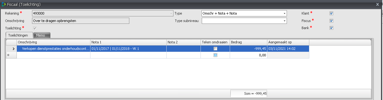 • Bij de tegenboeking (490.XXX rekening) ) krijgen we de volgende details in de toelichting