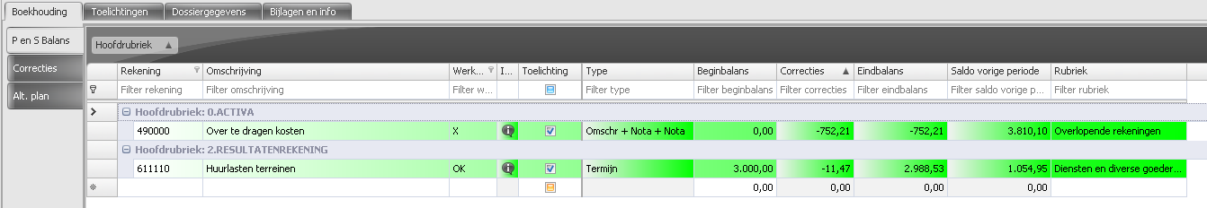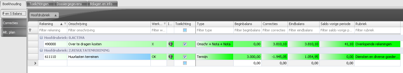 • In de balans zien we ook dat deze 2 rekening correct zijn toegelicht (groene kleur)