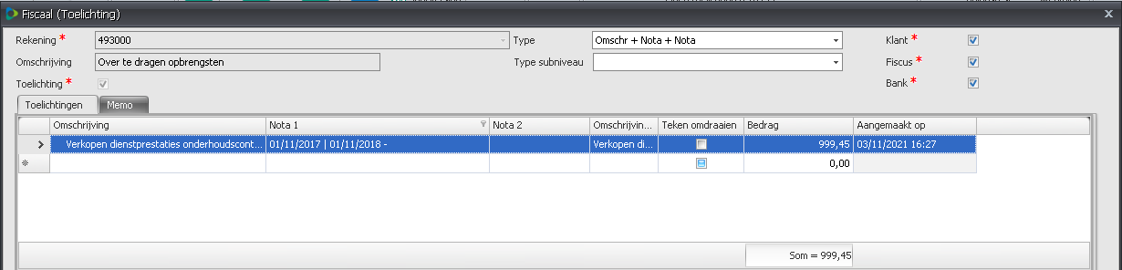 • Bij de tegenboeking (493.XXX rekening) ) krijgen we de volgende details in de toelichting