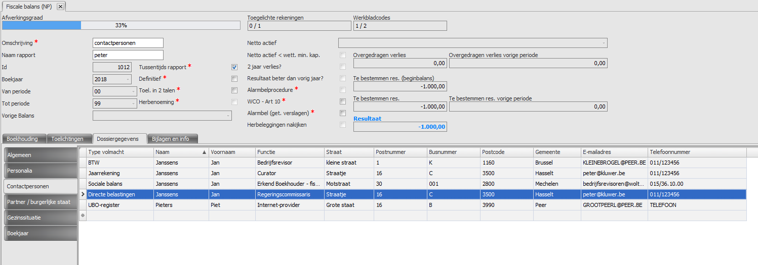 Dossiergegevens - Contactpersonen. De gegevens staan in het Fiscaal dossier op enkel-lezen. Elke wijziging moet eerst aangebracht worden in Kantoorbeheer via de tabbladen