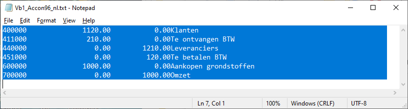 - Voorbeeld 2: Rekeningen met 12 tekens. Debet en credit met komma en met een spatie en nullen vooraan de bedragen. De omschrijving met een vaste lengte van 30 tekens.