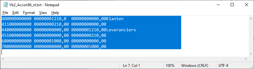 - Veld 1: het rekeningnummer, max. lengte 12 tekens. De eerste 4 tekens moeten numeriek zijn (deze 4 1ste cijfers worden gebruikt om deze nummers aan de jaarrekening te koppelen). Links uitgelijnd, dus rechts aanvullen met spaties.