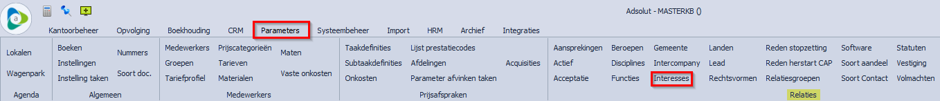 Indien u toegang heeft tot de CRM-module van Adsolut Kantoorbeheer dan beschikt u in het menu ‘Parameters’ – ‘Relaties’ over de knop ‘Interesses’: