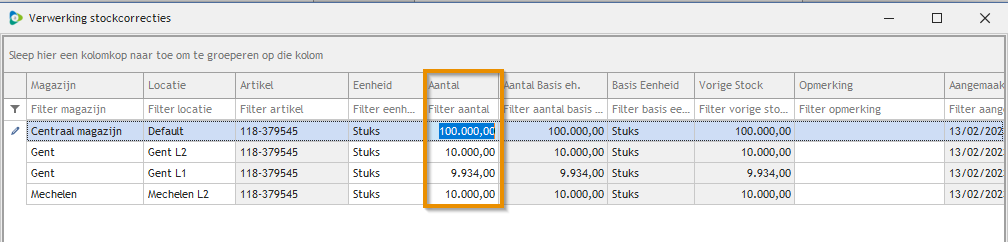 - Geef in de kolom Aantal de voorraadcorrectie in (**)