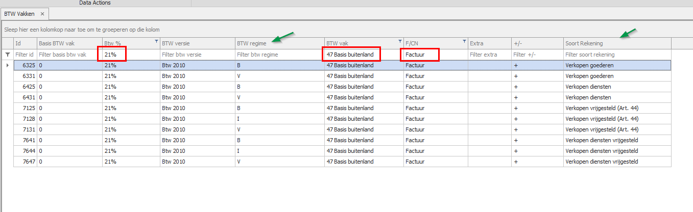U kan ook filteren op het BTW-vak om te weten te komen welke BTW-regimes, soort rek enz u dient te gebruiken.