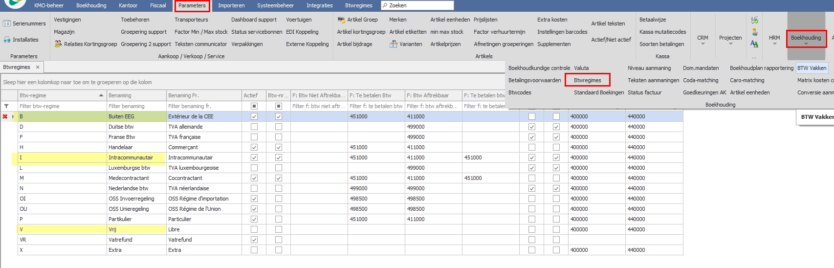 - Via parameters, boekhouding, btw-vakken kan u filteren op oa onderstaande kolommen
