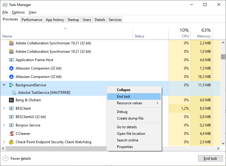 - Klik met de linkermuisknop op de service "Adsolut TaskService [MASTERKB]".
