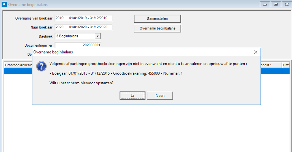 Bij de overname van de beginbalans wordt een controle uitgevoerd, namelijk nazicht of de afpuntingen van grootboekrekeningen in evenwicht zijn.