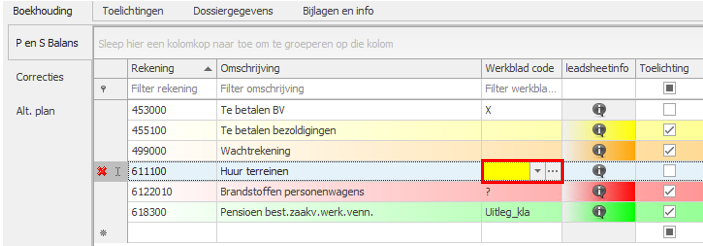 - Wanneer een toelichting cijfermatig correct werd toegelicht, kleurt deze rekening groen in de proef- en saldibalans. Dit betekent dat deze rekening afgewerkt is.