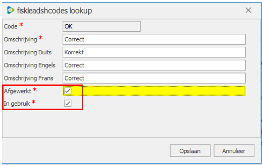Het veld "Afgewerkt" duidt aan of de werkbladcode in de afwerkingsgraad als afgewerkt wordt aangemerkt.