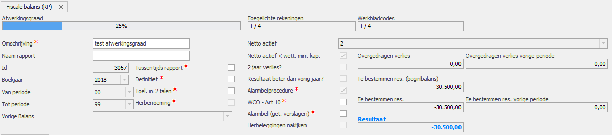 Bovenaan op elke fiscale balans wordt een balk weergegeven die op basis van een percentage aanduidt in hoeverre de balans is afgewerkt en gecontroleerd. De afgewerkte items worden getoond voor elke van de 2 parameters (toelichtingen en werkblad codes).