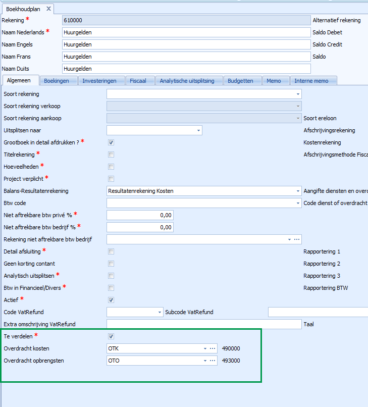 Nu kan u zien dat er in het boekhoudplan de instelling 'te verdelen' bewerkbaar is, en kan u hier de velden leegmaken.