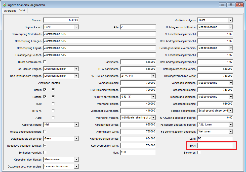 1. Om CODA-bestanden te kunnen verwerken moet er een financieel dagboek ("Ingave, Basisgegevens, Financiële dagboeken") bestaan en moet het rekeningnummer (IBAN) van de betrokken rekening aanwezig zijn in dit financieel dagboek.