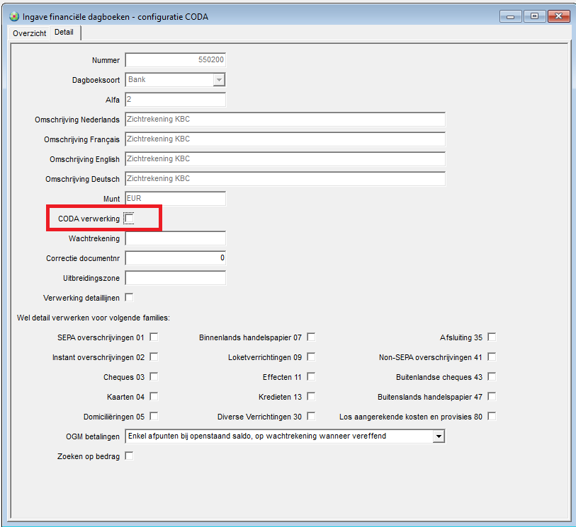 2. Om CODA-bestanden te kunnen verwerken in een bestaand financieel dagboek, moet dit financieel dagboek zo geconfigureerd zijn dat Coda verwerking toegestaan is.
