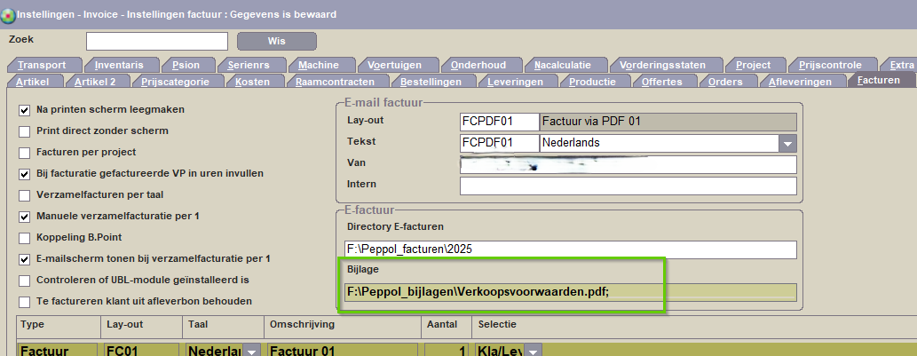 De Standaard bijlage die staat ingesteld bij Instellingen, Invoice, tabblad Facturen wordt automatisch voorgesteld maar die kan je aanpassen.