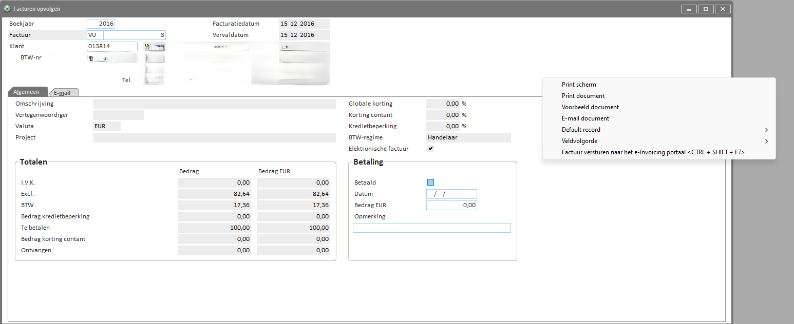 - Via rechtermuisknop heb je de optie Factuur versturen naar het e-invoicingportaal of gebruik de toetsencombinatie Ctrl+Shift+F7