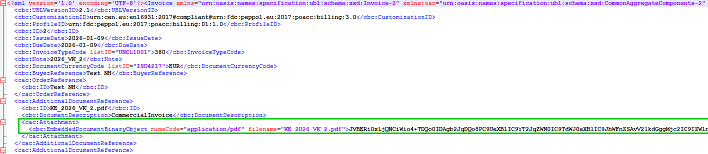 In de XML van de factuur zal er geen EmbeddedDocument opgenomen zijn onder de tag AdditionalDocumentReference.