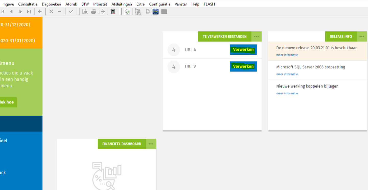 Situatie:U verwerkt Basecone en/of UBL-bestanden in een Expert/M-dossier door via de tegel 'Te verwerken bestanden' in het startscherm op de desbetreffende 'Verwerken'-knop naast de zichtbare opties UBL A, UBL V, Basecone A en/of Basecone V te klikken. Bij het aanklikken van deze knop(pen) gebeurt er echter niets. Het betrokken aankoop- en/of verkoopjournaal opent zich niet en u krijgt geen foutmelding.