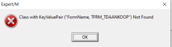- Beschadiging van de onderliggende programmabestanden. In dit geval zal u bij het manueel openen van het menu 'Dagboeken, Aankopen, Ingave aankopen' en 'Dagboeken, Verkopen, Ingave verkopen' een 'Class with KeyValuePair'-foutmelding krijgen. Deze foutmelding zal u tevens krijgen bij het openen van de betrokken menu's in alle Expert/M-dossiers (Ook degene waar er geen sprake is van Basecone en/of UBL-import).