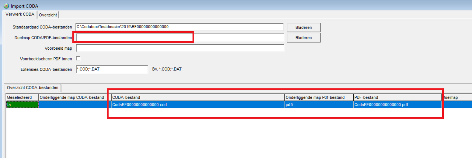 - Als u in dit scenario het veld "Doelmap CODA/pdf-bestanden" toch opvult met dezelfde folder als deze uit het veld "Standaardpad CODA bestanden" heeft dit een aantal gevolgen: