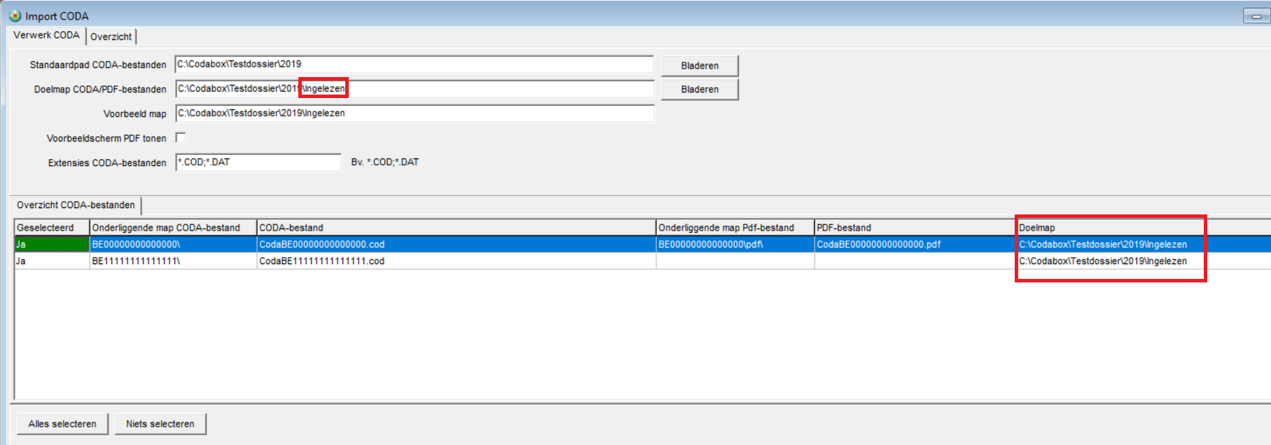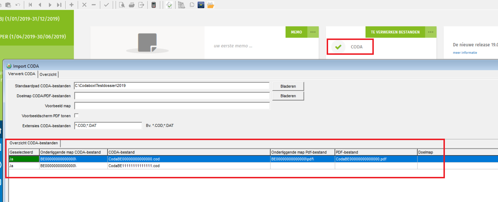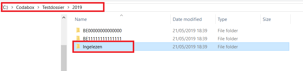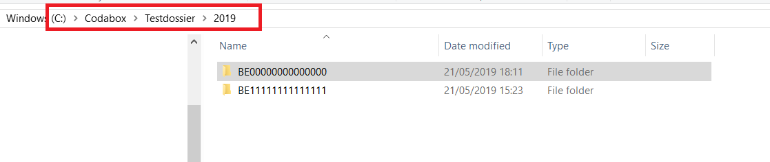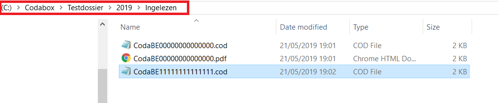 - De te verwerken CODA-bestanden worden opgeslagen in de folders "C:\Codabox\Testdossier\2019\BE00000000000000" en "C:\Codabox\Testdossier\2019\BE11111111111111".