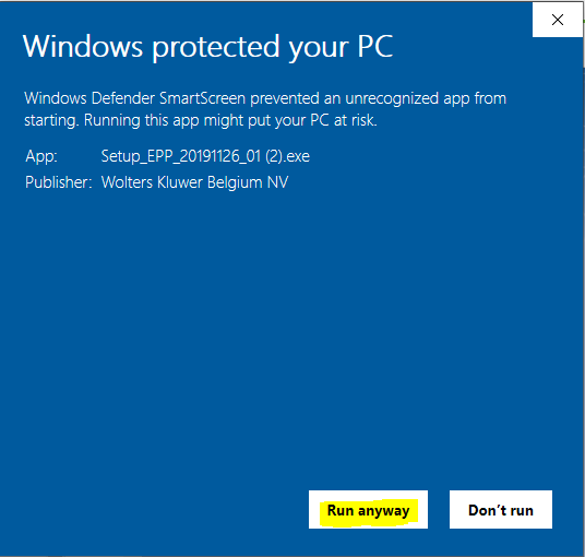 - Klik op de zichtbaar geworden "Run anyway"-knop zodat u de update van Expert/M kan uitvoeren.