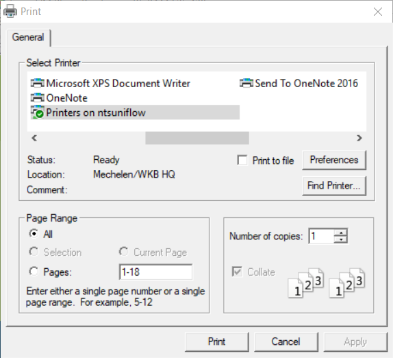 U krijgt een dialoogvenster te zien. Hierin bepaalt u welke printer u wenst aan te spreken, en aan welke parameters (bv. kleur, recto verso, afdrukstand, …) de afdruk moet voldoen. Door in dit dialoogvenster op de knop ‘Afdrukken’ te klikken, wordt het rapport afgedrukt.