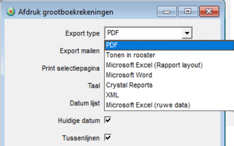 U hebt de keuze tussen pdf, Tonen in rooster, Microsoft Excel, Microsoft Word, Crystal Reports of XML.